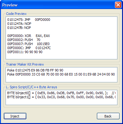 You can inject the code into the target process by pressing Inject. If you would like to make more modifications, or you only wanted to copy some of the text, press Back to return to the Auto-Assembler dialog.