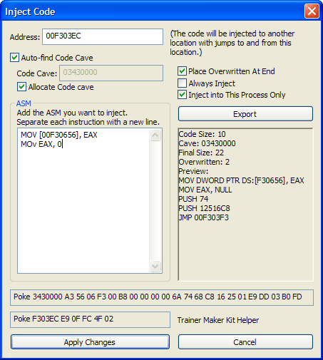 Near the bottom there are two Poke lines which can be copied and pasted into Trainer Maker Kit. The first is the code for the code cave and the second is the code for the control address to jump to the code cave.