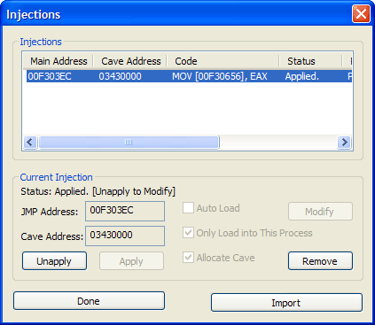 To remove an injection, select it and press Remove. Removing injections does not cause them to be unapplied; you must unapply manually if you want the injection to be removed from the target process.