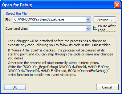 Pausing the ProcessYou have the option of pausing the process when it is loaded. You can perform this by either checking the Pause After Load check, or by writing the On_BeginDebug() script function and returning TRUE. By returning TRUE from the On_BeginDebug() script function, the process will be paused, even if Pause After Load is not checked. The script function allows you to check the process name and perform per-process operations, including any modifications to the process’ data or code, and setting up any script variables you would like to use during the debugging of the process. For more information on the On_BeginDebug event, see Script Events. |