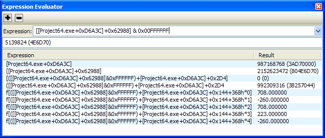 Even extremely complicated expressions are easily parsed and shown in real-time. This image shows the first five enemy Z positions in Perfect Dark® running in Project64 1.6, along with other expressions.
